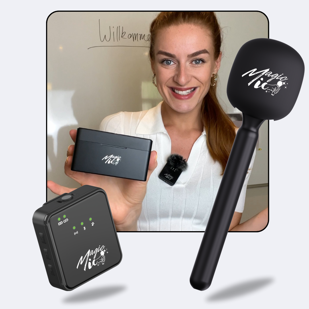 Das MagicMic™ Interview Set ist ideal für Coaches, Content Creator und Unternehmen. Im Set enthalten sind das MagicMic™ 3rd Generation Ansteckmikrofon, der Handadapter und die passende Tasche. Dank Rundum-Sorglos-Garantie garantieren wir besseren Content.