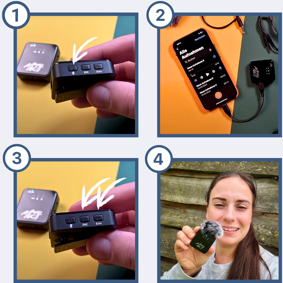 3.) Befestige das Mikrofon, halte es in der Hand oder nutze den Handadapter. Starte die Aufnahme.